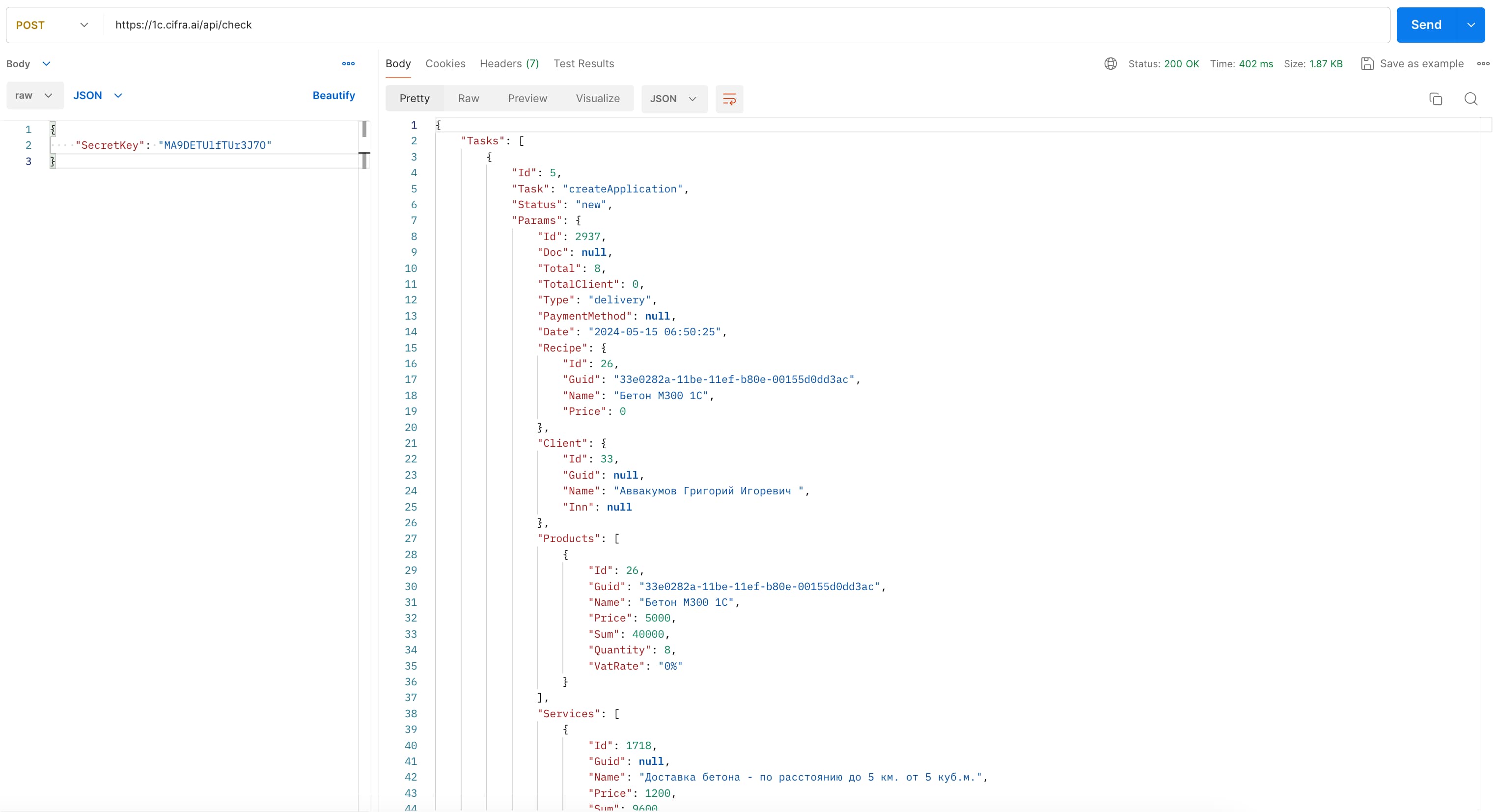 7. Склад. В данный момент в Цифре нет данных по складам 1С. Чаще всего бетон отгружается с одного склада в плане учета, поэтому добавьте значение склада в код или оставьте пустым