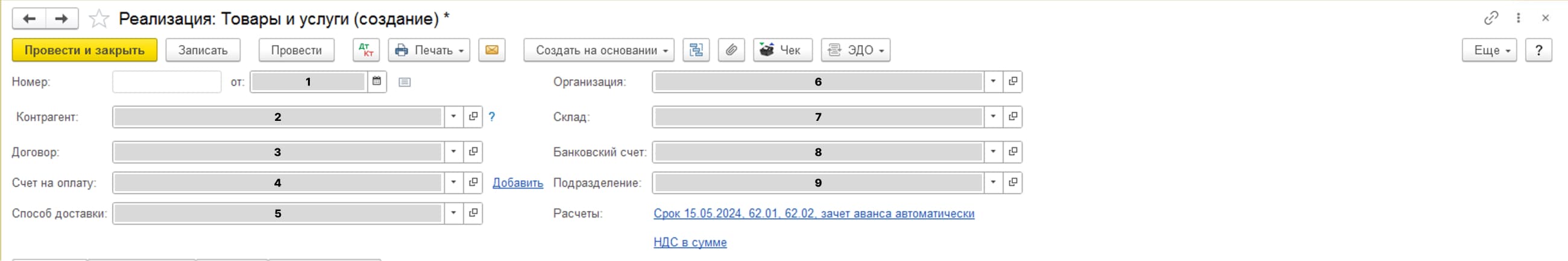 Для начала заполним данные, которые пользователь обычно видит в верхней части формы в 1С. В серых прямоугольниках проставлены номера в полях, которые мы должны заполнить: